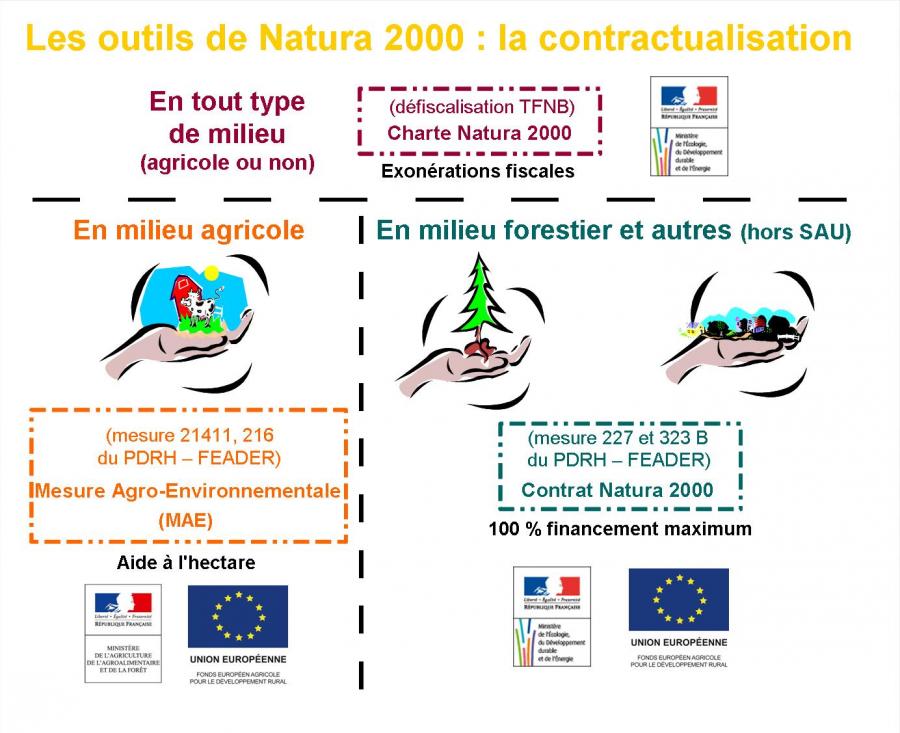 Ces actions ont un coût parfois important qu'un propriétaire privé, une association, une collectivité ne peut pas forcément supporter. C'est pourquoi des contrats Natura 2000 (pour les surfaces non agricoles) et des mesures agro-environnementales ou MAE (pour les surfaces agricoles), prévoient une aide financière publique pour la réalisation de ces opérations.